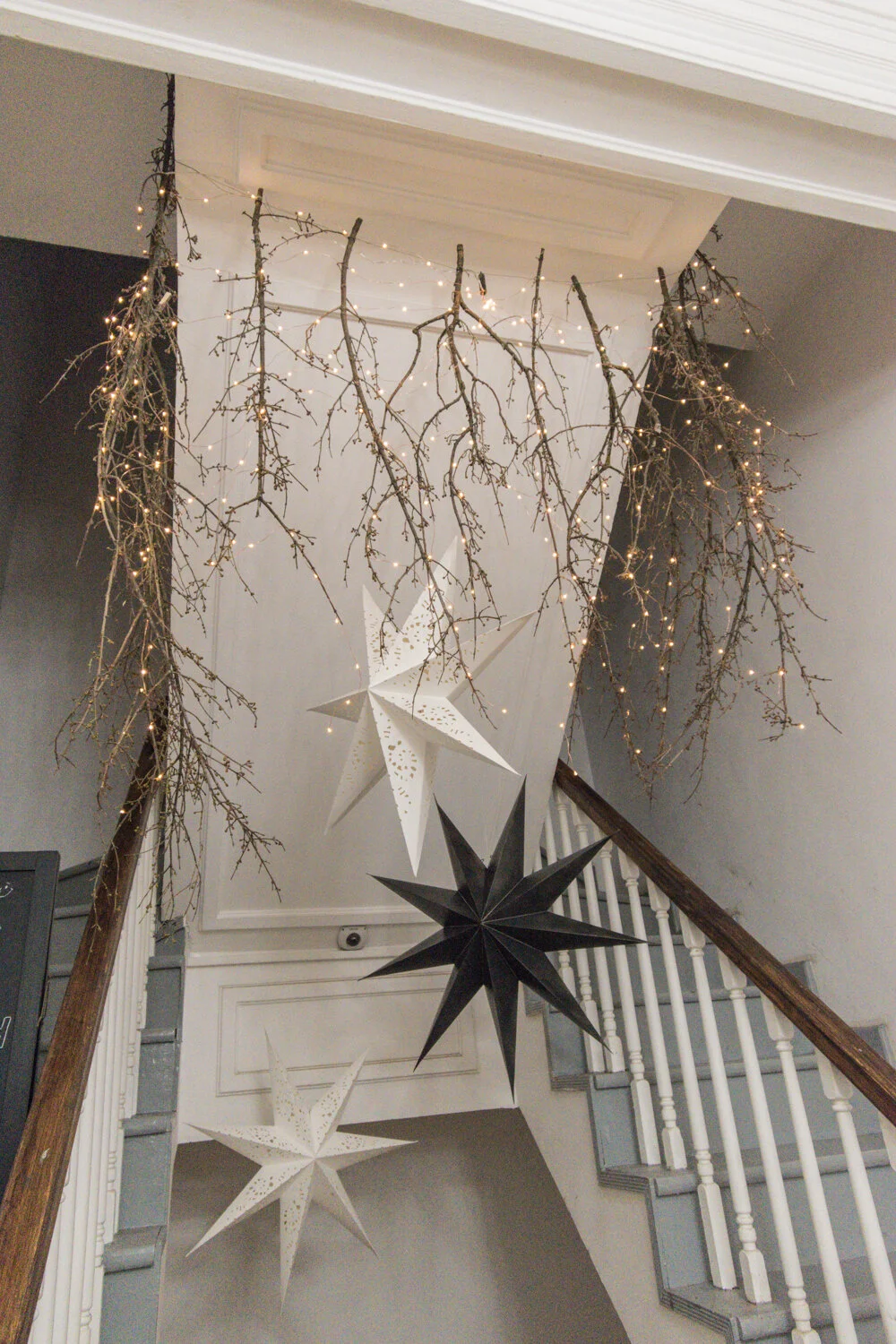 Kъщата, паметник на културата в сърцето на София , е едно от малкото останали бижута с високи тавани, дървени врати и прозорци, орнаментирани гипсови корнизи, кристални полилеи и изрисувани стени. Тя е една елегантна картина върху, която положихме още няколко щриха, за да внесем блясък, уют и празничност. Нежната и финна украса от стръкове евкалипт, дрян и дискретни светлини допълва елегентния стил на пространствата. Изобилие от малки лампички, наричани ангелски коси и звезди се спускат върху красивите дървени прозорци. Блещукащите светлини вътре, създават магичност , която предизвиква любопитство дори и в минувачите по уличата.
